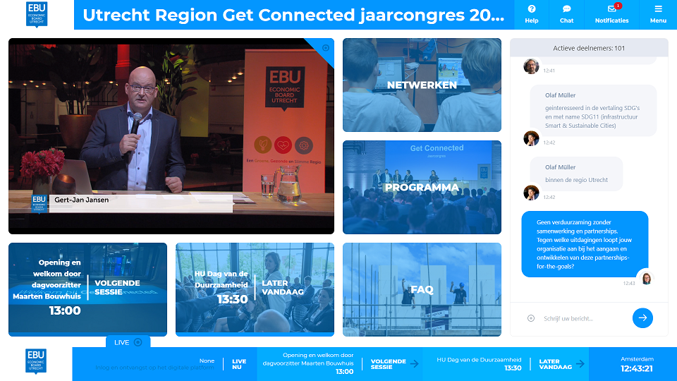 Op 8 oktober jl. was er weer een editie van het Get Connected Jaarcongres van de EBU, de Economic Board Utrecht. Een bijzondere editie, want dit keer konden ondernemers, bestuurders, beleidsmakers en onderzoekers uit de regio elkaar niet fysiek treffen. Toch gingen we ook tijdens deze editie met elkaar in gesprek gingen over gezond stedelijk leven, en hoe we voorbij de huidige crisis kunnen komen door innovatie en groen economisch herstel in de regio.